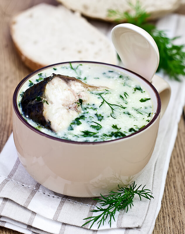 Następnie dodać pokrojonego w grubą kostkę fileta z dorsza. Połączyć obie śmietany z mąką, zahartować i wlać do zupy.