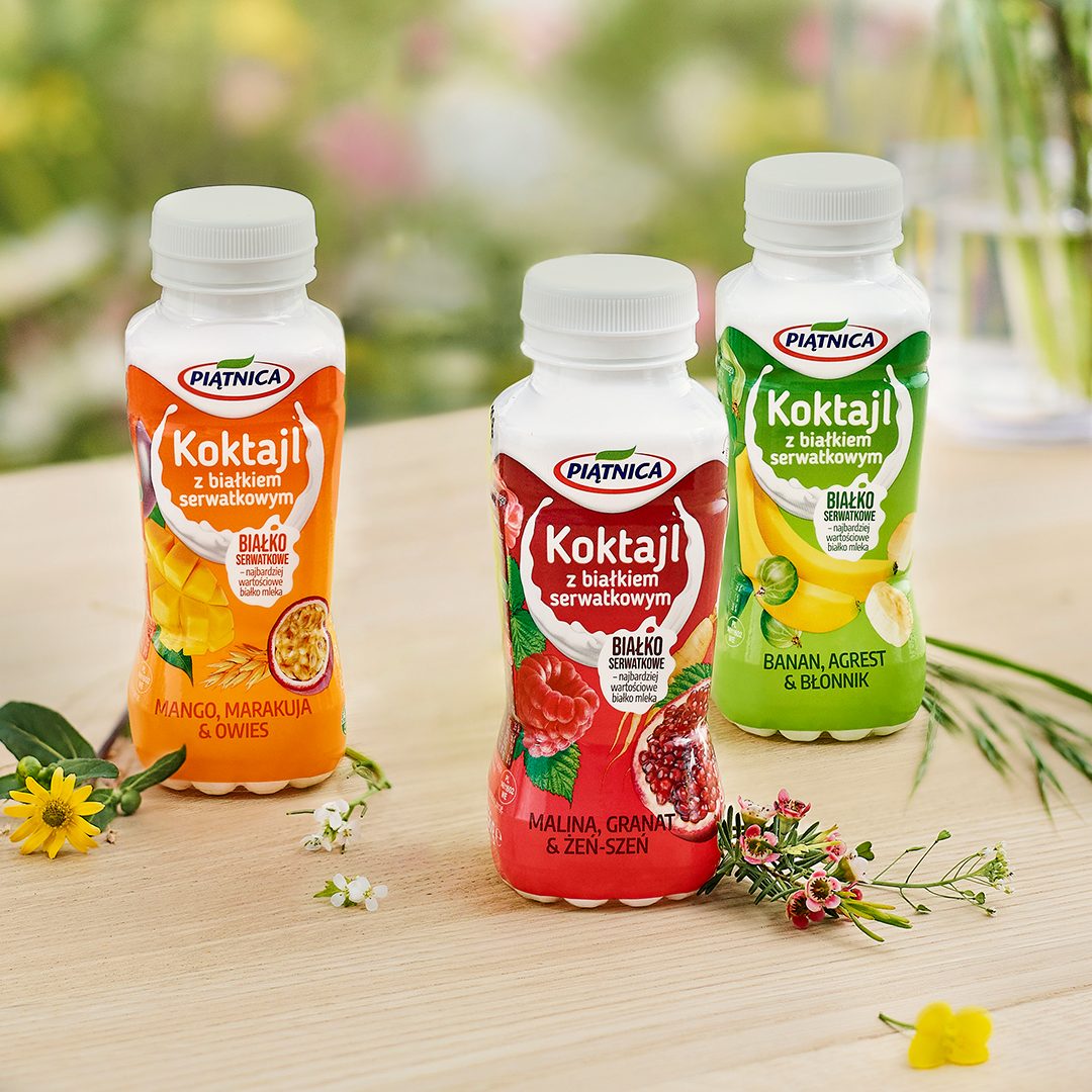 Koktajle z białkiem serwatkowym Piątnicy to nowa kategoria produktów, w których składzie występuje świeże, nieprzetworzone białko serwatkowe. Koktajle dostępne są w 3 wariantach smakowych: Malina, granat i żeń-szeń, Mango, marakuja i owies oraz Banan, agrest i błonnik, a każda butelka zawiera aż 28 gramów pełnowartościowego białka.