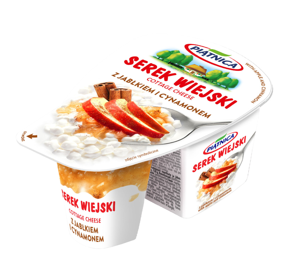 twaróg ziarnisty, śmietanka pasteryzowana, wsad jabłko z cynamonem ( jabłko 8 % w serku, cukier, zagęszczony sok z cytryny, naturalny aromat jabłkowy z innymi naturalnymi aromatami, cynamon 0,02% w serku), sól.