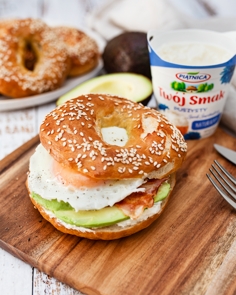 -  Gdy wszystkie składniki będą już gotowe złóż bajgla. Dolna połówka, awokado, 2 plastry boczku, jajko sadzone i druga połówka bajgla.